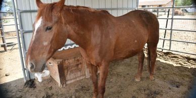Hope was a 20-25 year old Quarter type mare who was rescued from auction. Hope was severely emaciated and malnourished- every bone in her body could be seen from a distance. Hope was also pregnant when she was rescued and 10 days after her arrival at LBL hope gave birth to a beautiful little foal that we named Serenity, (Reni), and amazingly the foal was very healthy and thriving. As we got to know Hope more she was a bit shy of people but allowed herself to be haltered and was just a doll and loved to be scratched right on the top of her forelock. We found various traces of scarring all along her back, stomach, and legs- indicating possible severe physical abuse or a trailer accident. Hope had bad hooves and when the farrier came out it was found that she had one shoe on one leg that he estimated had been there for about a year.
